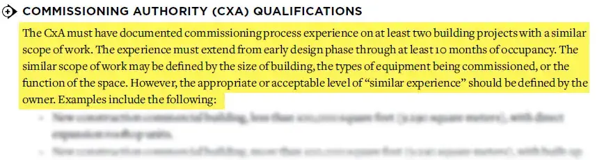 CxA, benzer bir kapsama sahip en az iki bina projesindeki devreye alma süreci deneyimini belgelendirmiş olmalıdır. Deneyim, erken tasarım aşamasından en az 10 aylık işletim sürecine kadar uzanmalıdır. Benzer iş kapsamı, binanın büyüklüğü, devreye alınan ekipman türleri veya mekanın işlevi ile tanımlanabilir. Ancak, uygun veya kabul edilebilir “benzer deneyim” düzeyi, proje sahibi tarafından tanımlanmalıdır. Benzer deneyime ait örnekler:…