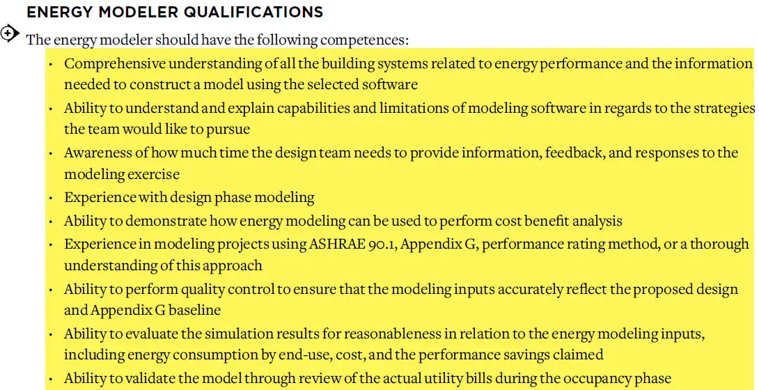 LEED sertifikası referans kitabında tarif edilen enerji modellemesi uzmanının niteliği aşağıdaki görselde belirtilmiştir: