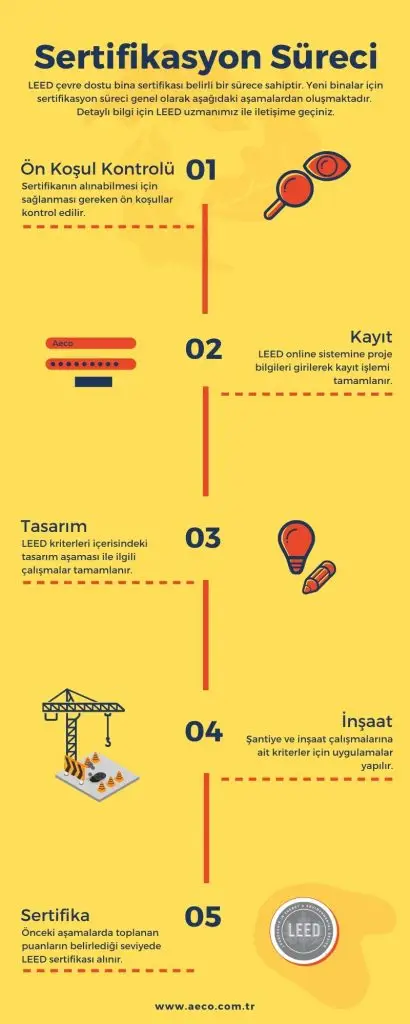 Aşağıdaki görselde, LEED çevre dostu bina sertifikası için sürdürülecek olan sertifikasyon süreci 5 başlık altında belirtilmiştir. LEED sertifikasına kayıt için öncelikle LEED ön koşullarına olan uyumun kontrol edilmesi önerilmektedir. LEED derecelendirme sistemi içerisinde yer alan tüm puanların toplanması, ancak ön koşullardan yalnızca bir tanesinin bile sağlanmaması durumunda sertifika alınamamaktadır. Dolayısı ile, projenin LEED sertifikasına kayıt işlemi öncesinde LEED Danışmanı firmadan ön koşulların kontrol edilmesini talep ediniz.